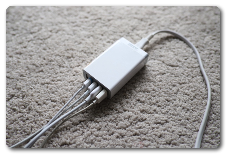 自宅では5ポートの充電器を利用しており、こちらも便利。筆者のiPhone、iPad mini、Apple Watch、妻のiPhoneは必ず毎日充電が必要で4ポートは常に埋まっています。残りの1ポートは時々、kindleや自転車のライトなどを充電するのに使っています。