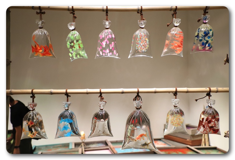 代表的な枡の中の金魚の作品をはじめ、食器やブリキ缶、城のプラモデルの内側など、様々なモノに金魚が表現されています。その他、金魚すくいのポイやTシャツ、海水パンツに直接金魚を描いた作品や、2mを超える大きな金魚の絵などもあり見応え十分。