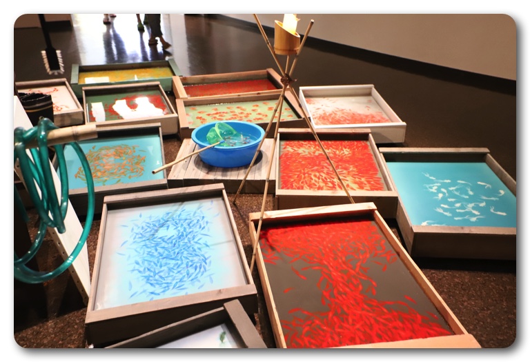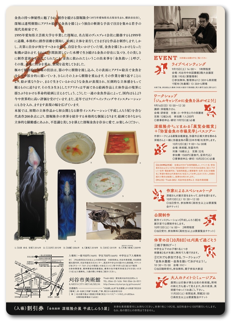 それはさておき、深堀俊介氏の作品は、どれも素晴らしく、唯一無二の作品。見た目にもわかりやすく、子どもと一緒に訪れても楽しめますので、ぜひ立ち寄ってみてください。深堀氏とのワークショップやライブペインティングはすでに終了しましたが、来月には深堀氏とまわる展覧会鑑賞」 +「弥富金魚の市場見学バスツアーやスペシャルトークショー、新作インスタレーション公開制作などが控えておりますので、ご都合の会う方は参加してみてはいかがでしょうか。なお、中学生以下の子どもと行くなら、「体育の日(10月8日)は刈美で過ごそう」の親子無料デーは中学生以下のお子様1名につき保護者2名が無料で入場できますので、この日が狙い目。