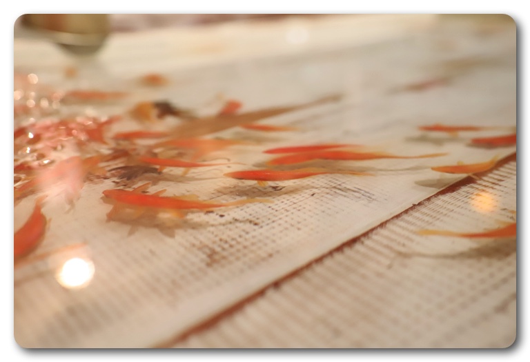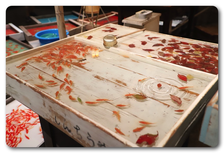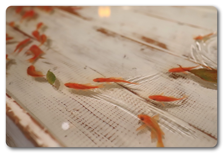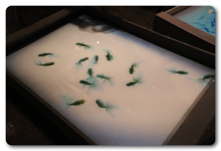 深堀氏の技法は器の中に樹脂を流し込み、その表面にアクリル絵の具で金魚を少しずつ描いて、さらにその上から樹脂を重ね、そしてまた金魚を描いていく…という作業を重ねていきます。それにより、絵が重なってまるで生きているような立体感のある金魚が表現されています。