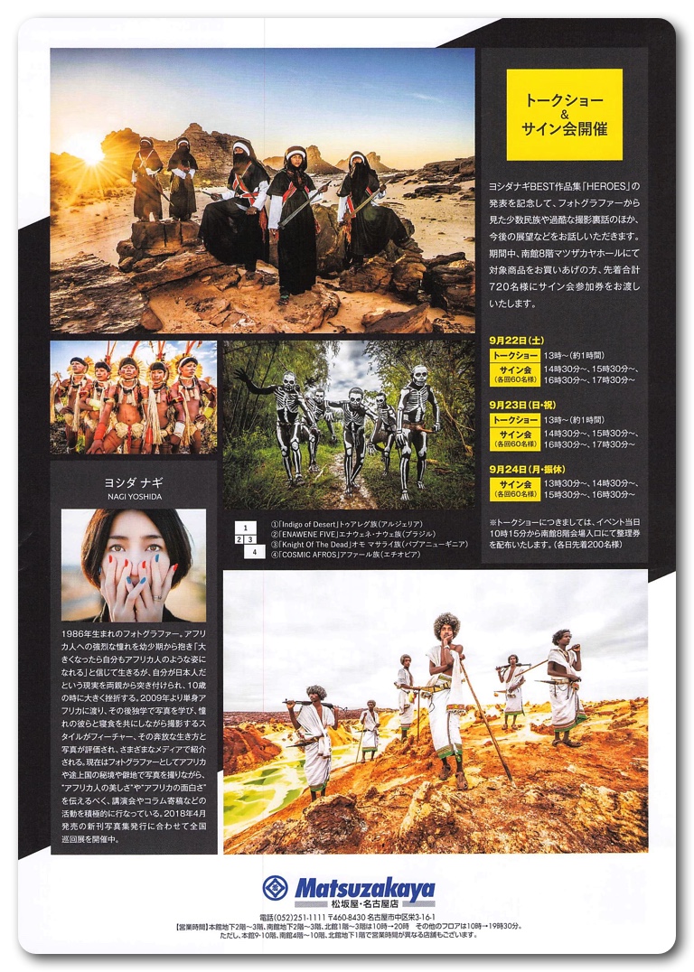 ヨシダナギBEST作品集「HEROES」の 発表を記念して、フォトグラファーから見た少数民族や過酷な撮影裏話のほか、今後の展望などをお話していただきます。 期間中、南館8階マツザカヤホールにて対象商品をお買いあげの方、先着合計720名様にサイン会参加券をお渡しいたします。9月22日(土)
