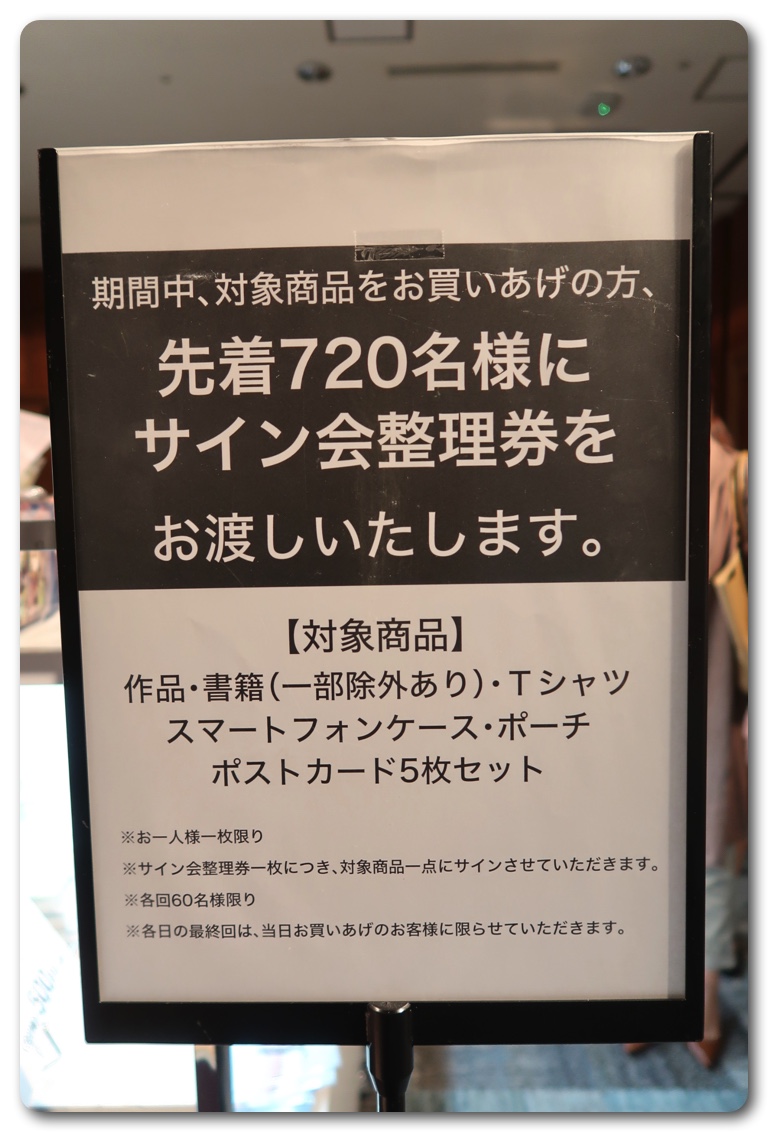 サイン会は期間中、ポストカードセットなどの対象商品を買った方に先着720名に整理券を配布しておりますので、早めに行くことをオススメします。