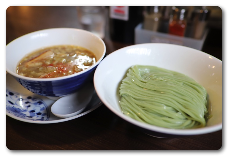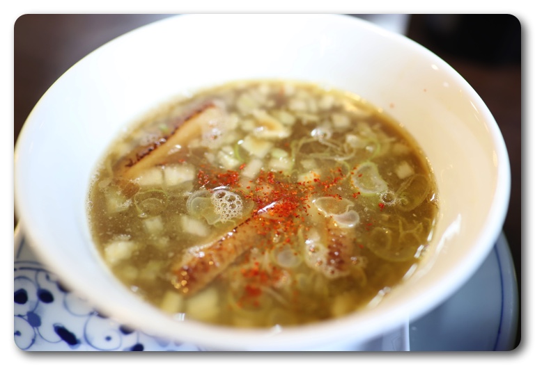 今回は妻と二人で訪れ、筆者は限定の鶏白湯にぼしつけ麺、妻は醤油らぁめんを注文。麺の色が以前と違って緑がかっており、店主に聞いたら「スピルリナを練り込んだ麺を作りました」とのこと。まだ一週間ぐらいだそうですが、味は以前と違いはないように感じました。ただし、見た目は普通の麺の方がいいかな…。