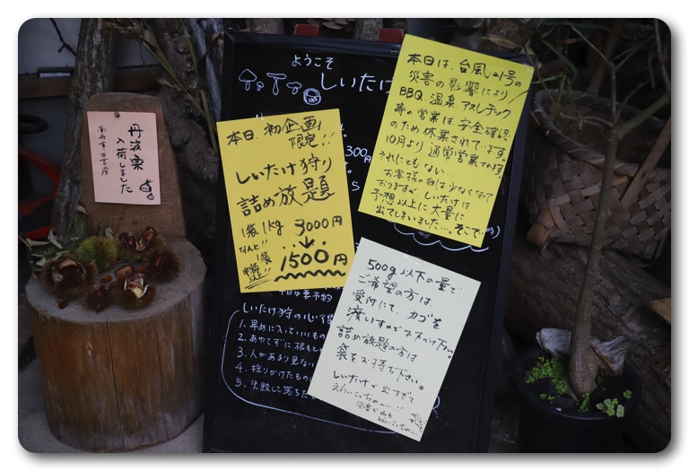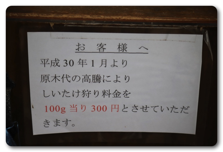 普段は100g300円となかなかのお値段ですが、訪れた9月23日(日)は周りの施設が休業しており、その影響でお客様が来ず、用意した原木しいたけが育ち過ぎて供給過多のため、袋いっぱい取り放題で1,500円という破格値になっていました。