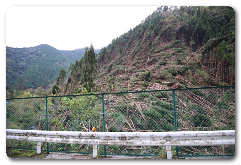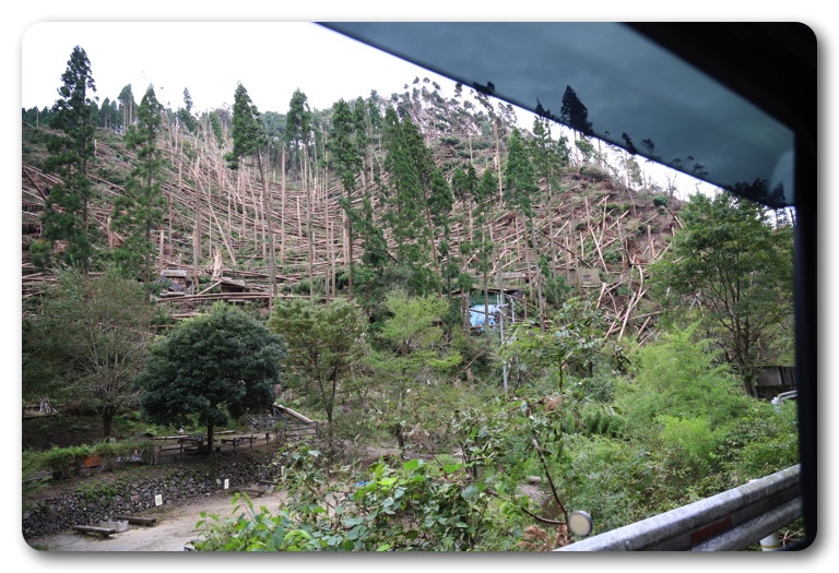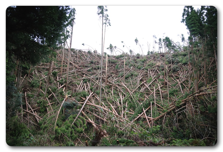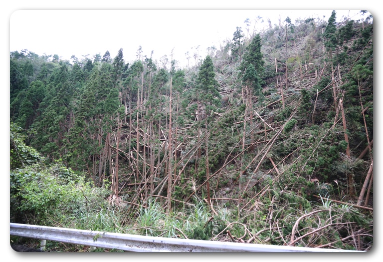 道中の風景。大きな木が一定方向になぎ倒されています。