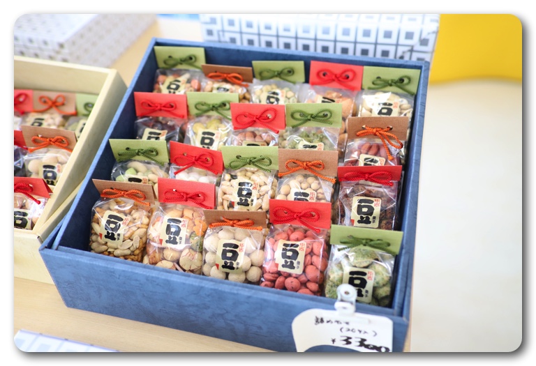 店名になっているピーナッツをはじめ、様々な豆製品が並んでいます。自宅づかい用のボリュームがあるお値打ちなものから、手土産やプレゼントに最適な小袋に入ったものまで色々揃っています。