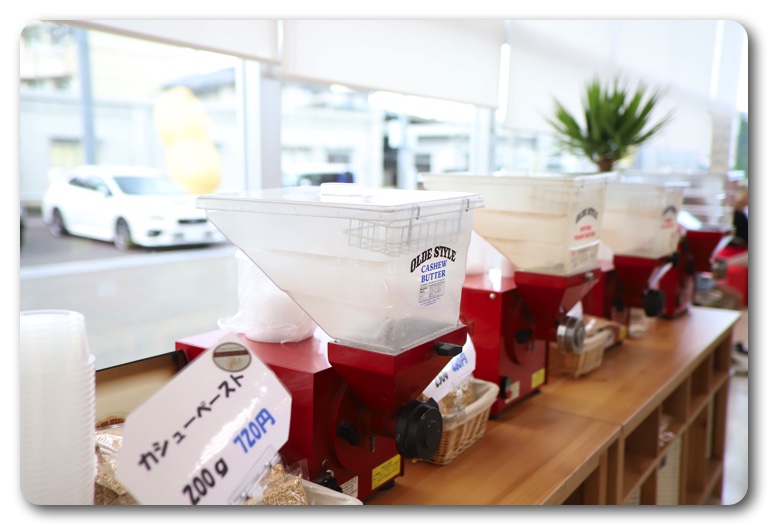 そして、一番この店の中で惹かれたのはピーナッツペーストをその場で作ってれるサービス。プレス機が置いてあり、横においてあるピーナッツを上から入れると、すぐにペースト状になって出てきます。完全無添加できたてのピーナッツバターはめっちゃ美味しい。ただし、ピーナッツそのままなので、甘みはありません。パンに塗るなら少しクリームチーズと砂糖を混ぜるとさらに美味しくいただけます。