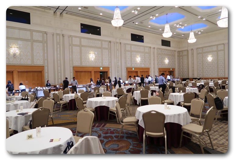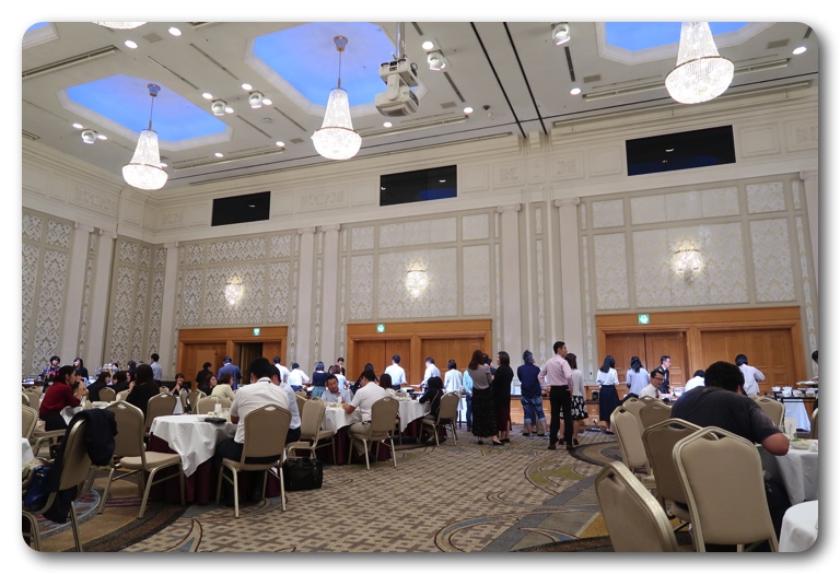 会場のボールルームは以前、友人の結婚式で訪れたことがありますが、約4年ぶり。大きなシャンデリアがぶら下がっており豪華絢爛。テーブルは丸テーブルで隣との空間はゆったりとしたレイアウト。よほど大きな声で話さない限り、隣の人に会話の内容を聞かれる心配はありません。