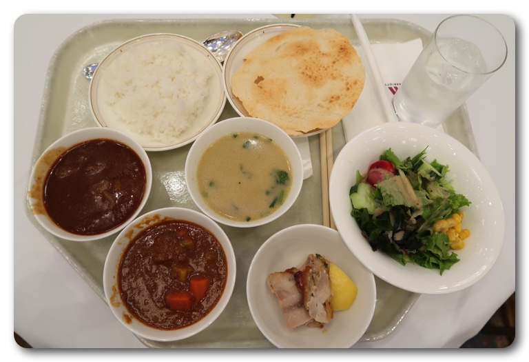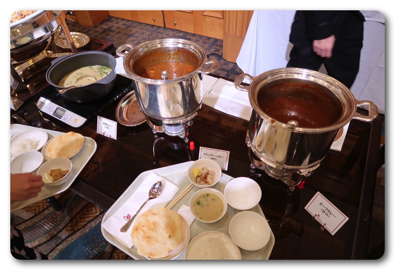 会場は16階の大宴会場ボールルーム、超豪華で広いホール。大人数の結婚式で使うホールなので、ゆったりとした空間で食事ができます。今回は3種類のカレーと、ナン、ライス、サラダ、コーヒー・紅茶・マンゴージュースなどのドリンクが付いて税込1,200円と場所や雰囲気を考えるとコスパ良し。