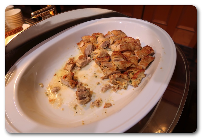 まず最初にプレートを取ります。ライス皿を一枚とカップを4つ取り、それぞれによそっていきます。ナンは小さく切られていますので、適当に取りました。ひとり一枚は食べきれませんので、いい方法だと思います。インドのせんべい「パーパル」もありましたので一枚ゲット。