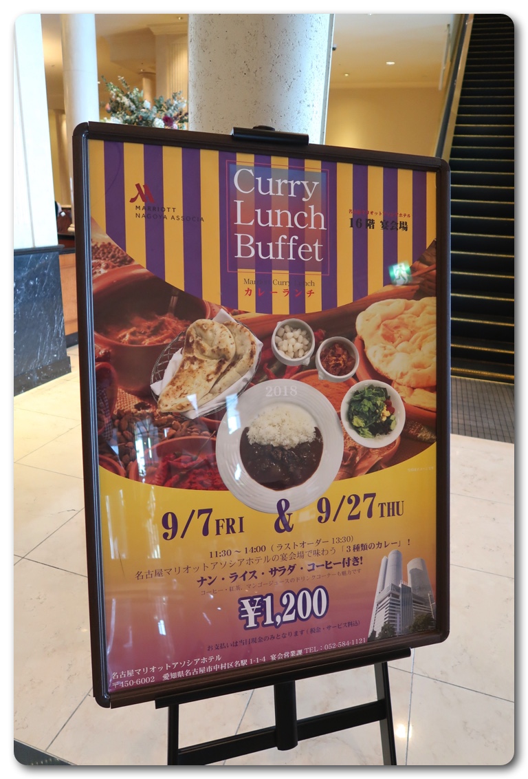名古屋マリオットアソシアホテルで毎月、平日に1,2回開催されるカレーランチビュッフェに行ってきました。以前から、ずっと行きたかったのですが、なかなか休みが合わず、やっと訪れることができました。