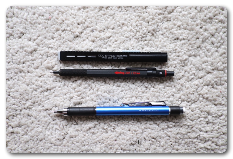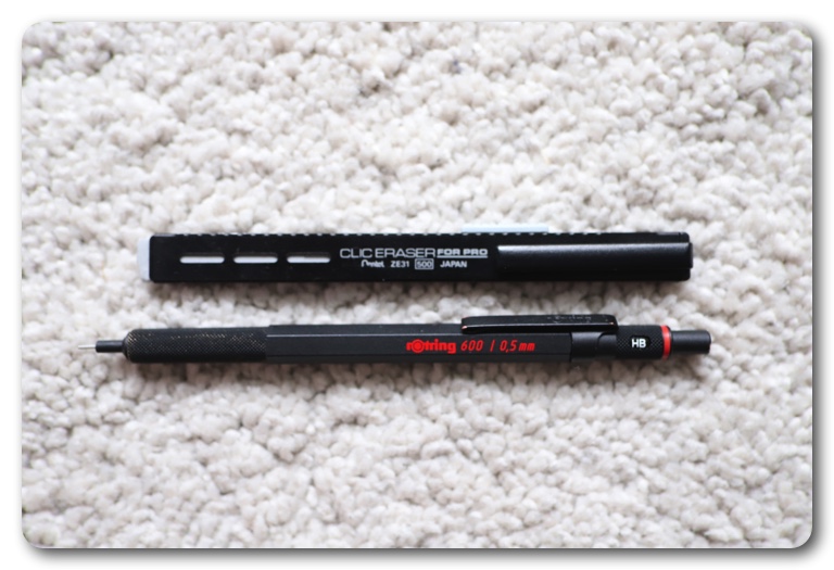 そんな訳で、久しぶりにシャープペンシルを使うことになりました。しばらく使っていなかった、rotling600を引き出しから引っ張り出し、消しゴムも頻繁に使うので、ぺんてるのCLIC ERASER FOR PROを一緒に使い始めました。どちらも製図用のプロ向けなので、使い心地は抜群なのですが、2つをウエストポーチに挿したり出したりするのが億劫になってきました。