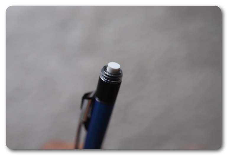 ウエストポーチにはジェットストリームの他、4色ボールペンのLAMY2000も挿てあるため合計4本になっており、いちいち目で見て確認しないと取ることができません。なんとかシャープペンシルだけにできないかと思ったのですが、rotling600の後ろについている消しゴムは本格的なものではなく、実際には使えません。何かいいシャープペンシルがないかと文房具売場を探していたら、うってつけの商品がありました。