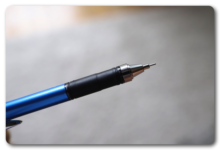 またフレノック機構を搭載しており、本体を上下に振るだけで芯がでます。いちいち握りかえてノックしなくていいのは本当に便利。なお、フレロック機構が搭載されているため、持ち運ぶ時などに意図しない芯の繰り出しを防止できます。