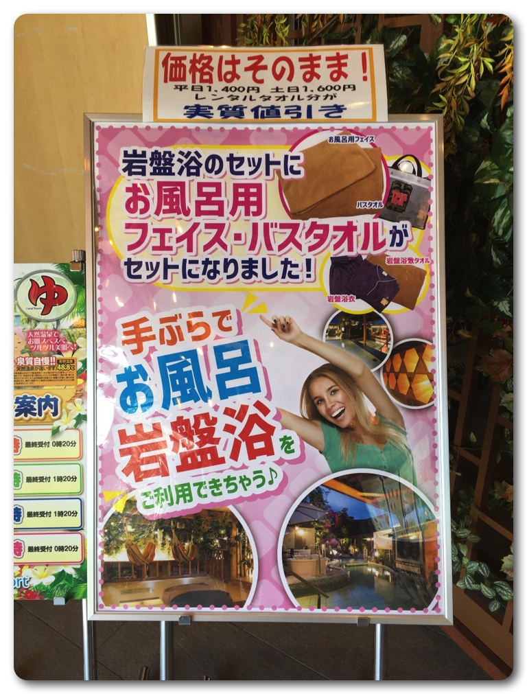 お風呂用フェイスタオル&バスタオルは通常200円で貸し出されているのですが、岩盤浴の価格据え置きで追加されたので実質値下げということになります。