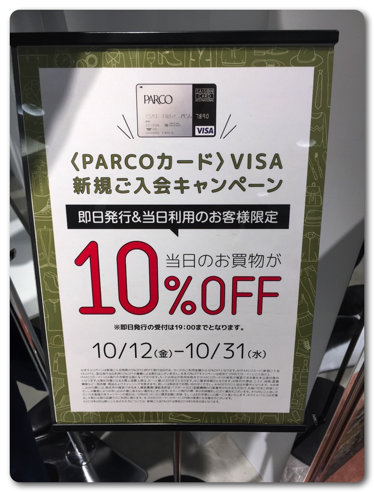 その日は閉店間際だったため、日を改めて訪れました。名古屋パルコでは10月12日(金)〜31日(水)までの期間中、パルコカードに入会すると当日のお買い物が10%OFFになるキャンペーンを実施中。