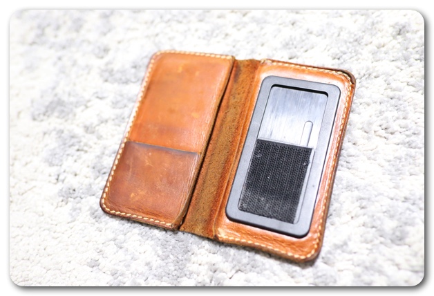 ちなみにiPhoneのカバーは本皮のオーダーメイドで製作されたものを使っています。仕事で使う際には裏にカメラ用の穴が空いているのが嫌なのですが、市販されているiPhone用のカバーはほぼカメラ用の穴が空いているものしかありません。Android用に販売されているカバーでようやくカメラ用の穴がないものを見つけました。サイズが大きかったため、作家の方にお願いしてiPhoneSEのサイズピッタリで作ってもらいました。撮影する時は上にスライドさせる手間が必要ですが、見た目がスッキリしており満足しています。