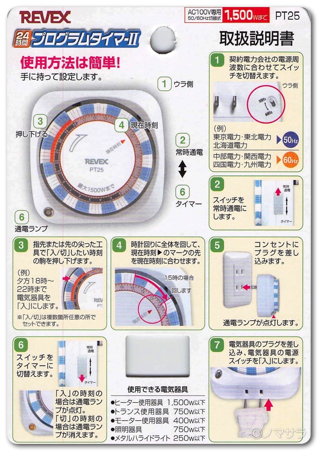 1,500W以下の電化製品なら使えますので、たいていの家電は大丈夫。無人で毎日電源のオンオフをするような家電製品がある場合は、この 「24時間プログラムタイマー2」を使ってみてください。