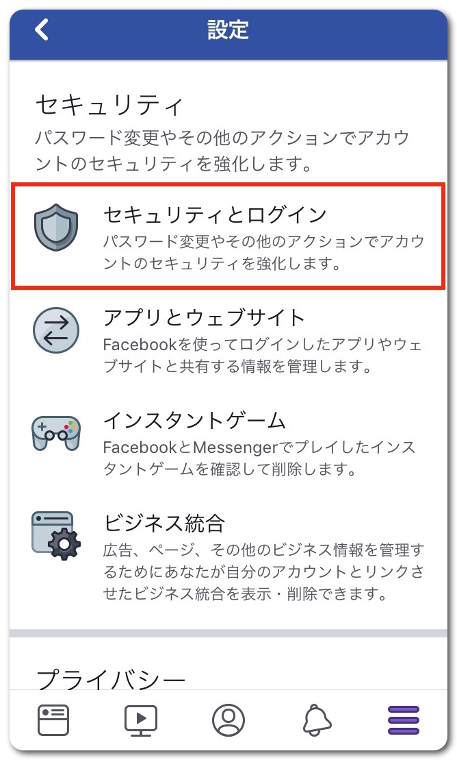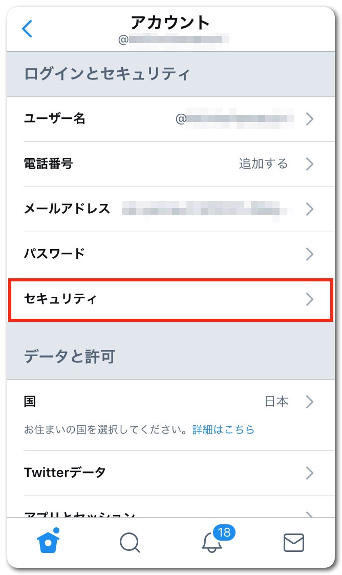 「セキュリティとログイン」をタップ