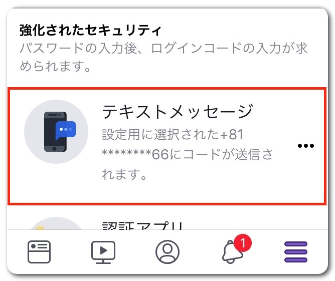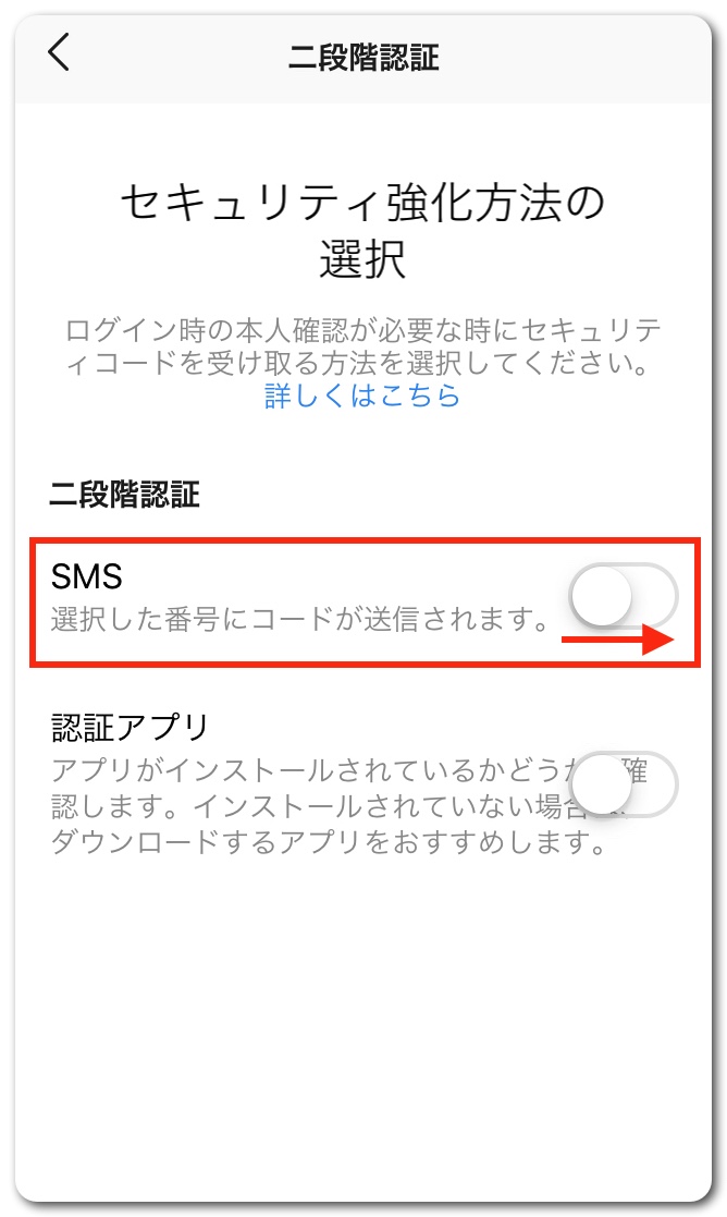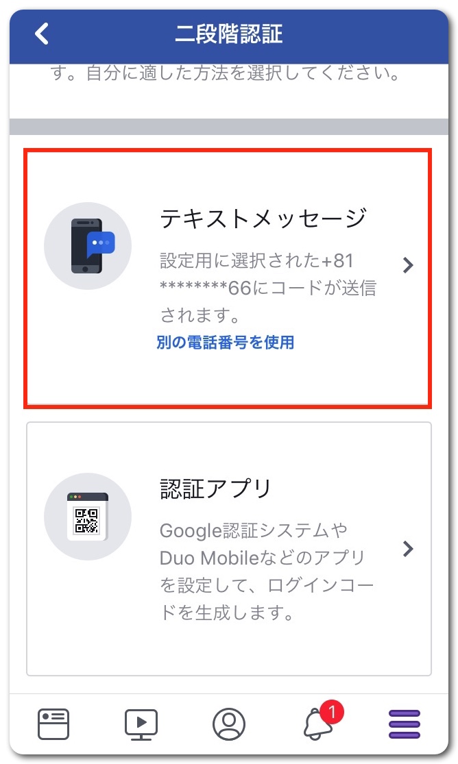 二段階認証の方法をSMSか認証アプリか選びます。
