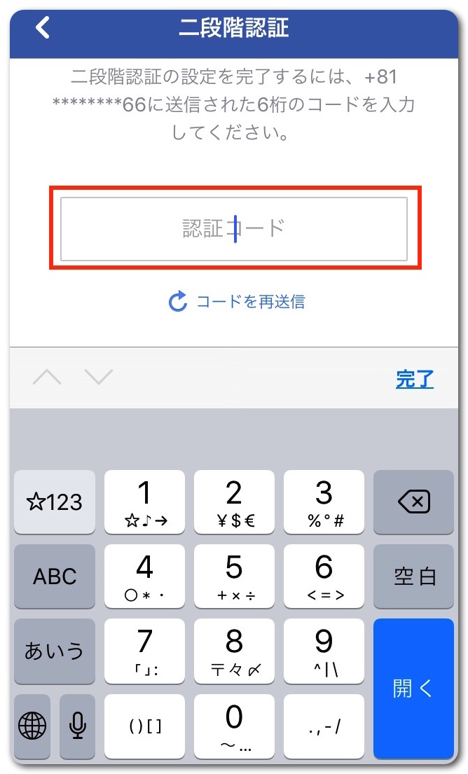 SMSで認証コードが送られてくるので、6桁のコードを入力し「次へ」をタップ