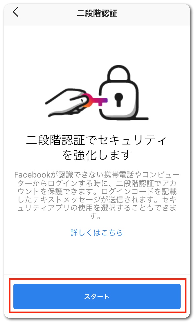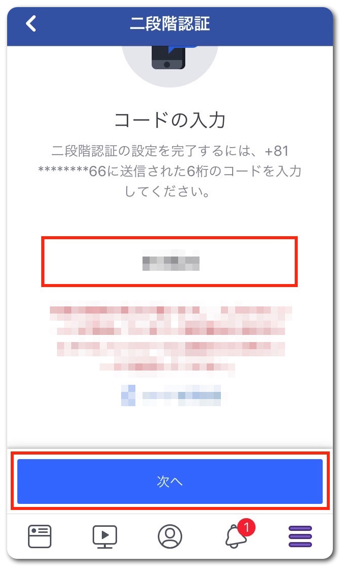これで二段階認証はオンになりました。「次へ」をタップ。