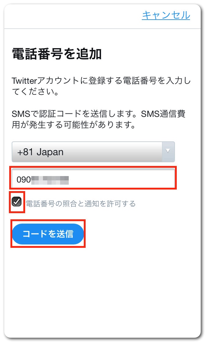 電話番号を入力し、「電話番号の照合と通知を許可する」にチェックを入れてから、「コードを送信」をタップ