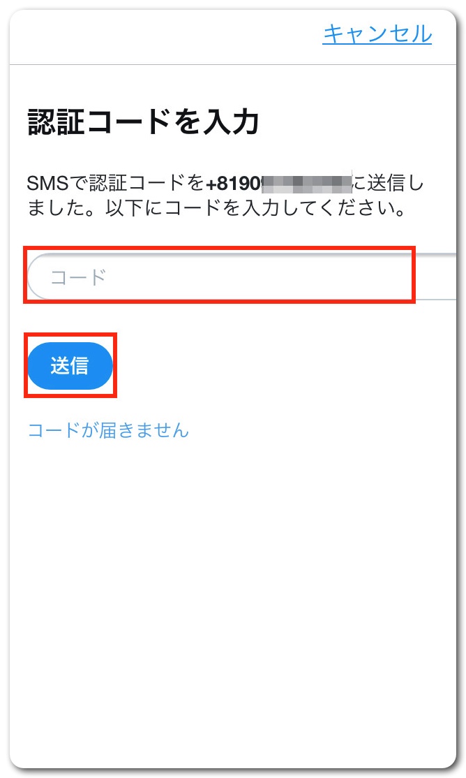 SMSで認証コードが送られてくるので、コードを入力し、「送信」をタップ