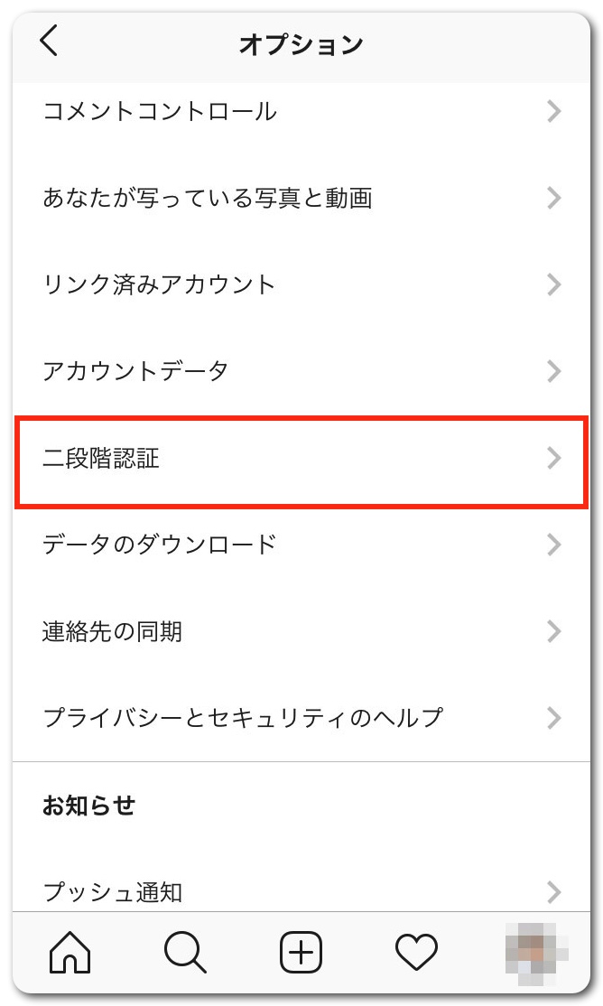 少し下にスクロールして「二段階認証」をタップ
