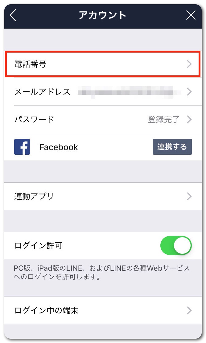 アカウントの電話番号をタップ