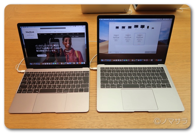 12インチのMacbookとも比較してみました。左側がMacbook。もう、速度の遅いMacbookを買う理由はありません。