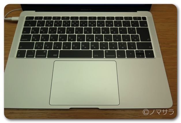 キーボードはMacbookProと同じタイプで、旧モデルよりストロークは浅くなっています。タッチに関してはまずまずといったところ。可もなく不可もなく、それなりの打鍵感。