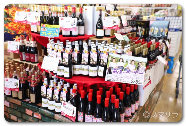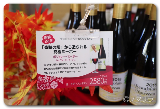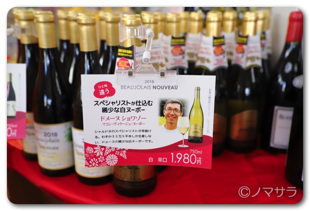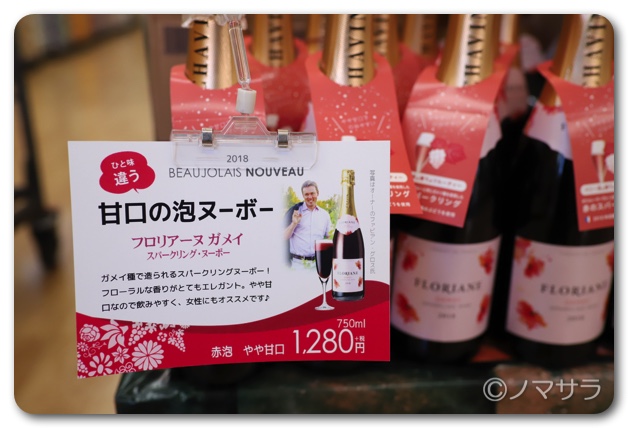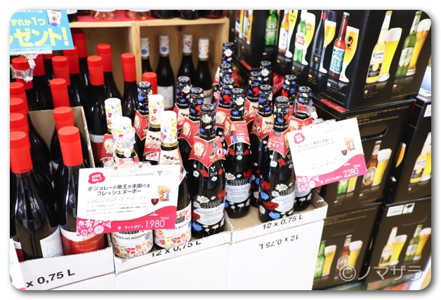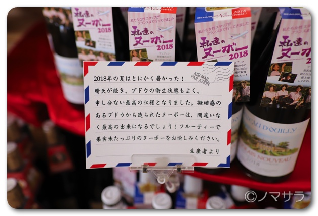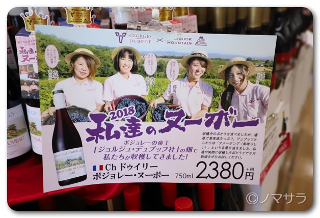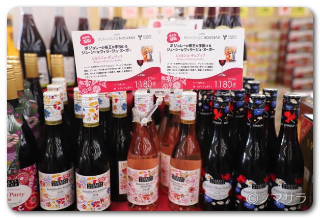 行きつけのリカーショップでは特設コーナーを設けて、ボジョレー・ヌーボーを販売しています。今年の目玉のボジョレー・ヌーボーをはじめ、様々なワイナリーのオススメ商品が陳列されています。