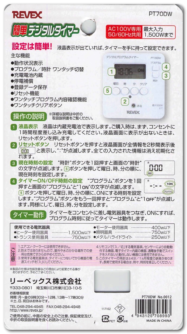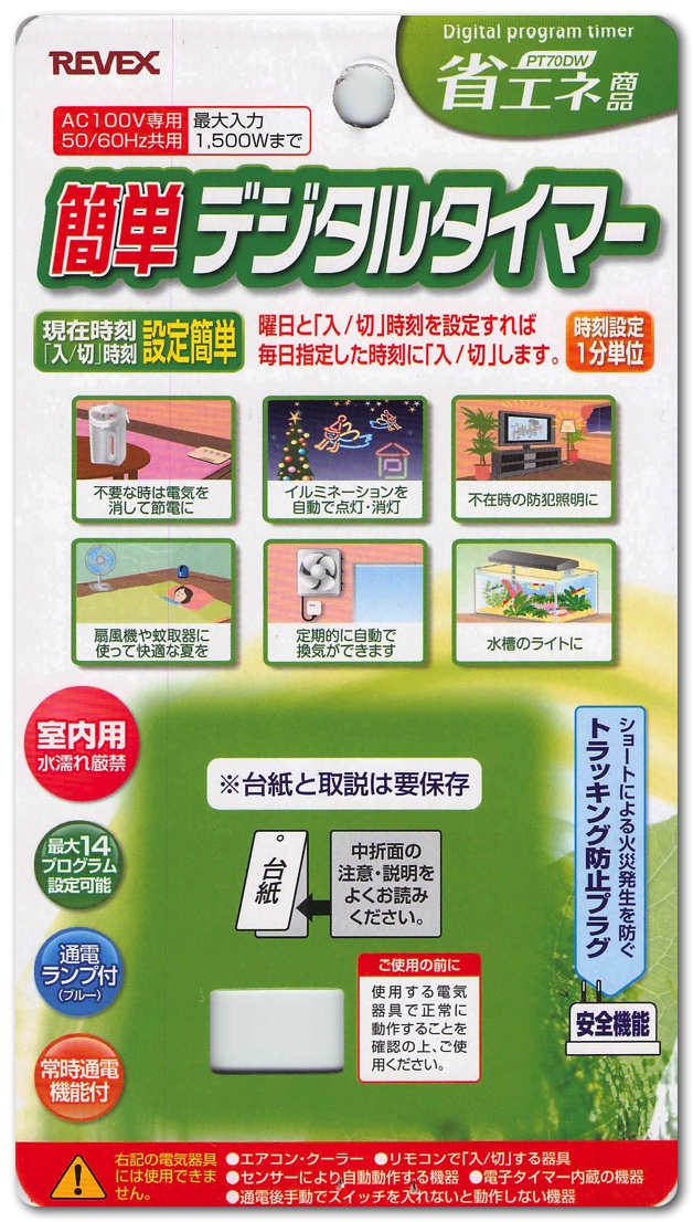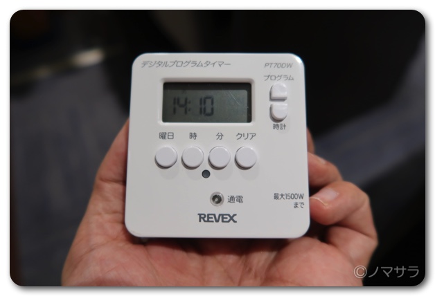 新たにamazonやヨドバシカメラなどで調べて探り当てたのが、同じメーカーであるREVEXの「簡単デジタルタイマー」。このタイマーはデジタル時計が内臓されており、コンセントの電源自体が落ちたとしても、充電池が内蔵されているためデジタル時計はそのまま動き続けてくれます。終夜電源でない場所でも指定の時間に 「入/切」 ができます。
