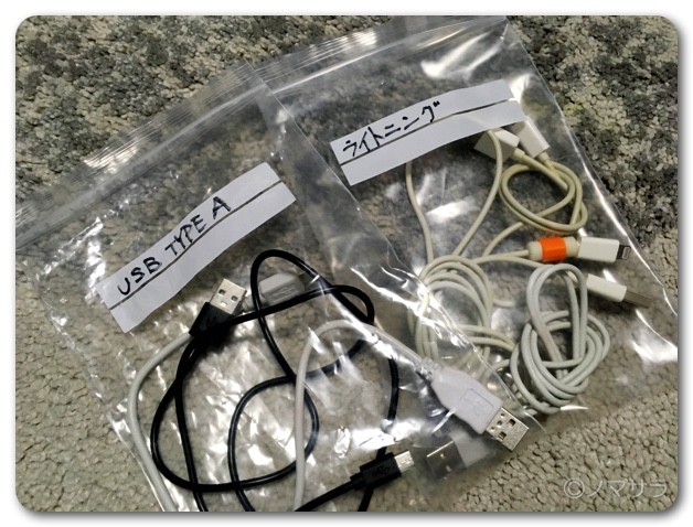 ケーブル類は百均で買ったビニールポーチに種類ごとにまとめて、シリコンゴムでひとつずつ束ねて保管する。天然ゴムは時間とともに劣化してひっついたりするので、シリコンゴムがオススメ。早速、実践しました。確かにこれでどのケーブルが不必要に多いのかがわかります。