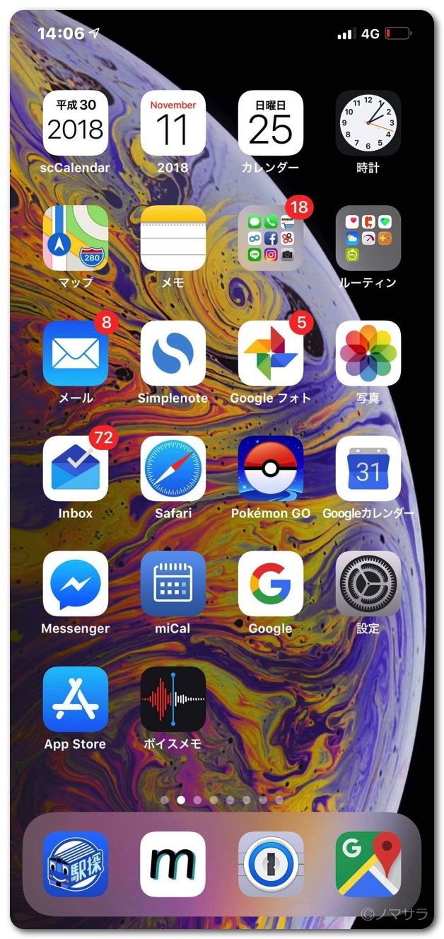 1画面目は頻繁に使うアプリを配置。1軍アプリは画面下のホーム枠に。あ、ポケGOがある(笑)