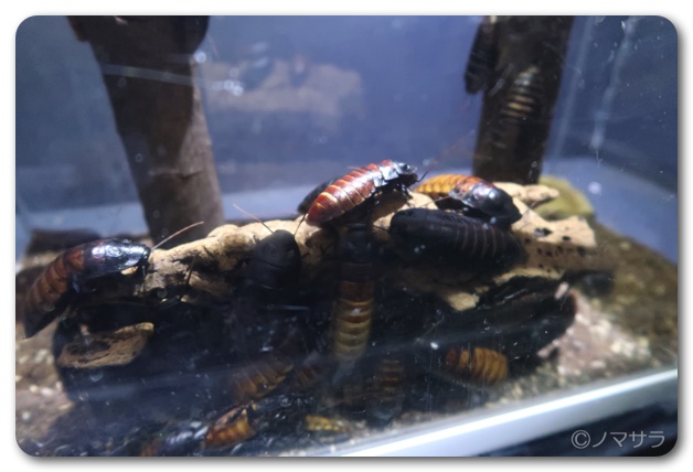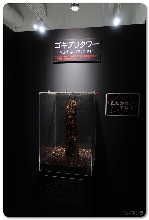 入口を入ってすぐ目に飛び込んでくるのは「ゴキブリタワー」。以前、昆虫館で見たことがありますが、ここのタワーは大きくてヤバイ。首筋がゾワゾワします。