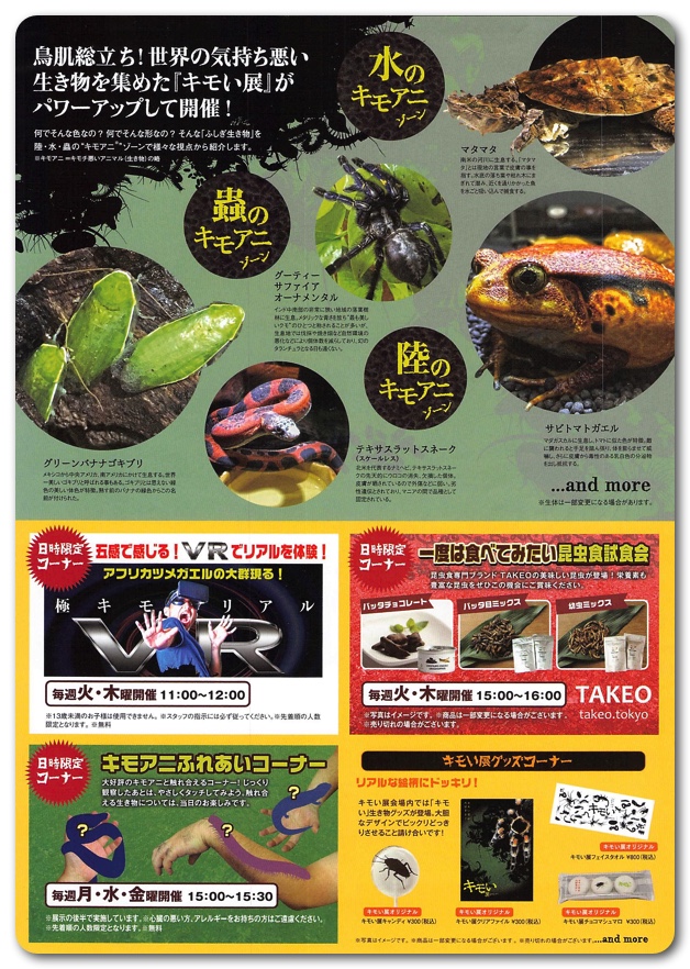 マタマタ、クビガメ、アフリカツメガエル、ツギオミカドヤモリ、テキサスラットスネーク、ゾンビクラブ、ヨロイモグラゴキブリ、メキシカンレッドニータランチュラなどが勢揃い。ここからは特に閲覧注意!