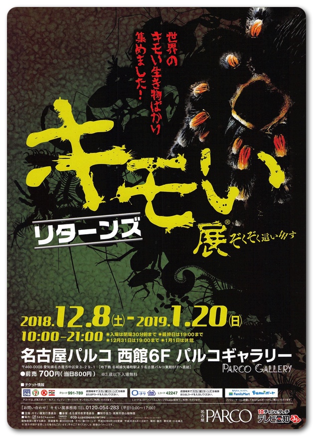 名古屋パルコで12月8日(土)から開催中の 「キモい展リターンズ」に行ってきました。前回の 「キモい展」も相当にキモいアニマルがいっぱいおり、一緒に行った妻は「キャーキャー」言っておりました。
