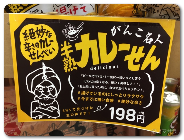 2017年3月19日の日曜もアメトーークのカレー大好き芸人で紹介された絶妙な辛さのカレーせんべい「がんこ名人 半熟カレーせん」が近所のリカーマウンテンで売っていました。たまたま見ていて、とても気になっていたのですが、なかなか売っておらず、すっかり忘れていましたが、リカーマウンテンの店頭でPOP付で販売されており、迷わず購入。