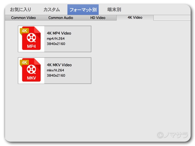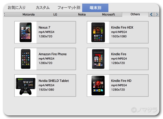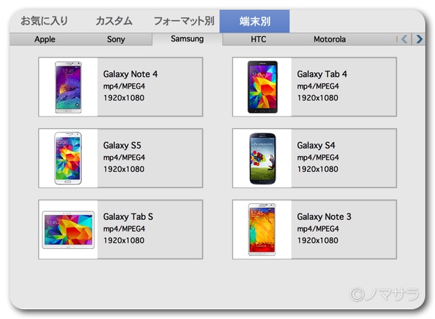 そのほか、 「HD動画変換プロ」という項目ではフォーマット別、端末別でありとあらゆるフォーマットに変換することができます。汎用のMP4をはじめ、AVI、MKV、MOV、WMV、TS Video、MPEG-1・2などおそらく現時点で世の中に出回っている全てのフォーマットに対応しているのではないでしょうか。