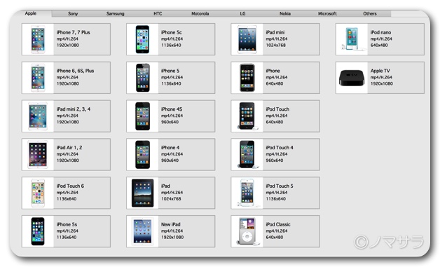 また端末別ではメーカー毎に、様々な端末が揃っています。iPhoneは最新のiPhoneXSなどはありませんが、iPhone7の1920☓1080を選んでおけば問題ありません。その他、SONY、Samsung、HTC、Motorola、LGなどのメーカーがありますが、基本的には1920☓1080もしくは1280☓720を選べばいいので、機種はあまり関係ありません。自分の機種がないからと気にする必要はないでしょう。