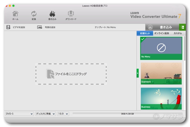 一方、「Leawo HD動画変換プロ」ではファイルをドラッグして、タイトルメニューの種類を選び、DVDもしくはBDの形式を選び書き込みボタンを押すだけで簡単に作成できます。