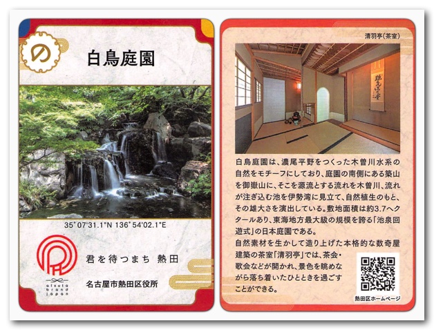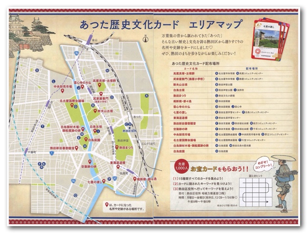 万葉集の時代から謳われてきた「あつた」。そんな古い歴史と文化を誇る熱田区から選りすぐりの名所や史跡の情報がカードになりました。カードの種類は15種類。カードはひとつの場所に2枚あるところがほとんどなので、8箇所廻れば全部集めることができます。