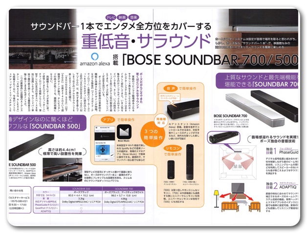 以前、BOSE SOLO5、YAMAHA YAS-108などを紹介しましたが、今回は新発売になったBOSE SOUNDBAR 500&700を紹介します。この2つの新製品は革新的な機能と洗練されたデザインが特徴。