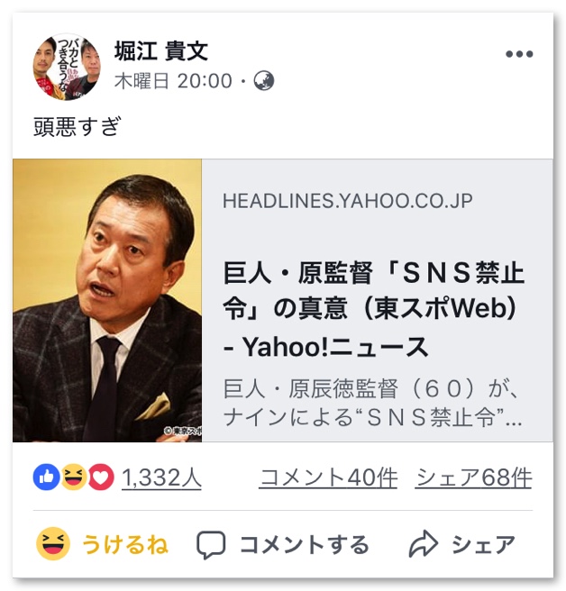 スポンサーが読売新聞ということを配慮しての発言かもしれませんが、時代錯誤も甚だしくて驚きを通り越して呆れました。この発言にホリエモンも「頭悪すぎ」と発言されていましたが、まさにその通りだと思います。