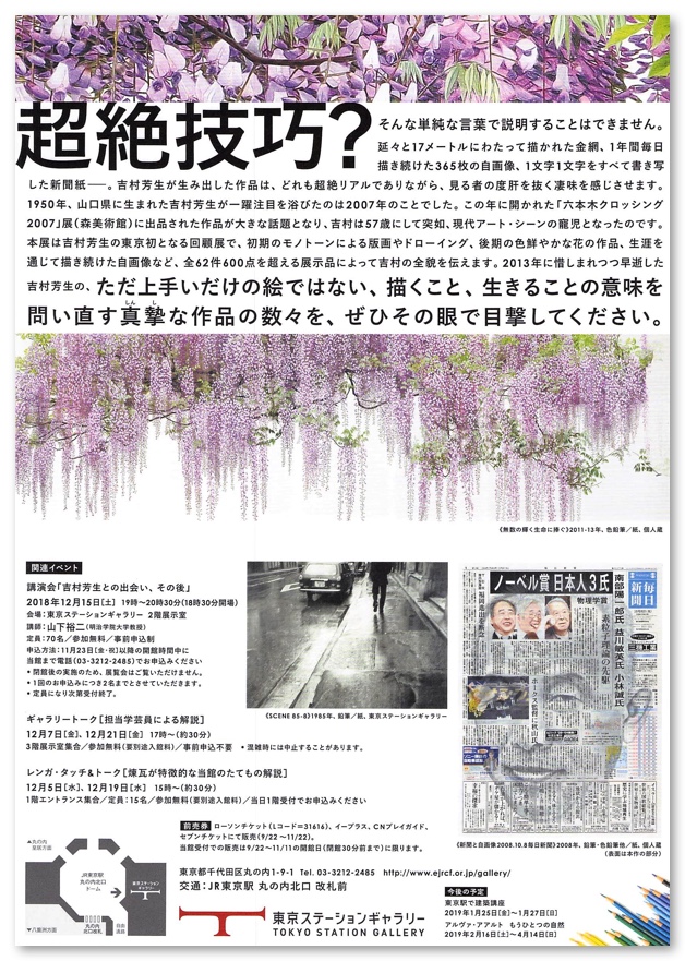 東京ステーションギャラリーは東京駅丸の内北口改札になり、とても立地がよく便利なので出張や旅行のついでに気軽に立ち寄ることもできます。今回の吉村芳生氏の展覧会は友人のホラノコウスケ氏に紹介いただきました。数多くのアート展に行かれており、3つほどオススメいただいた中で一番興味があり行くことに。
