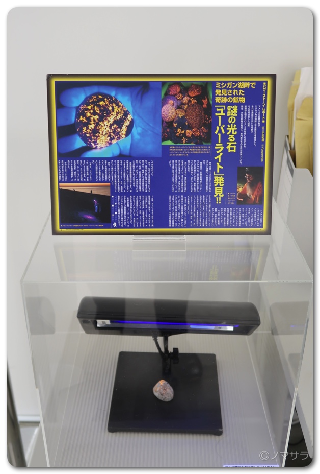 謎の光る石が展示されていましたが、筆者も似たような石を持っています。ブラックライトを当てると発光して魅惑的で惹き込まれます。