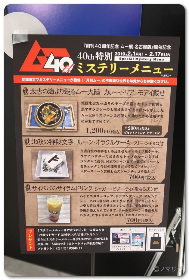 また名古屋パルコ東館4F・Carlova360 NAGOYA 店内カフェではムー40th 特別コラボのミステリーメニューが登場!味はどうかわかりませんが、ネタにはなりそう。