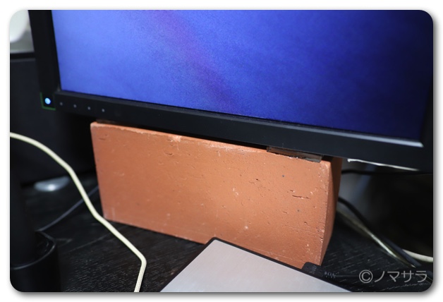 モニターアームを買おうか迷いましたが、頻繁に移動させることはないので、スタンドを外して、ホームセンターで購入したレンガに耐震用ジェルを挟んで固定しています。ちょうど後ろにワイヤーラックがあり、いい感じで固定できています。